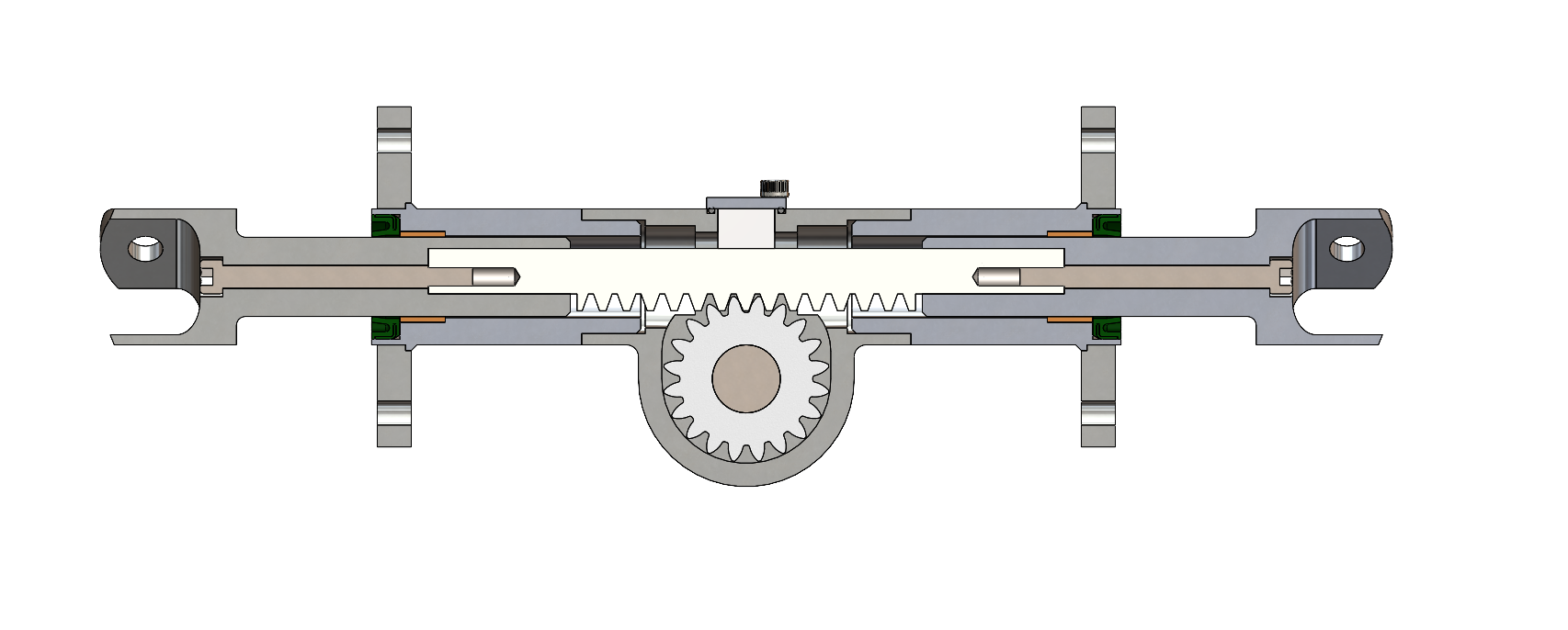 The body of the rack is custom made from 6061 aluminum. The steering clevises are made from 7075. The gear rack is an off the shelf gear rack that we machine down to reduce size and weight. The steering pinion is a custom machined 8620 blank which was custom hobbed to ensure minimal backlash.